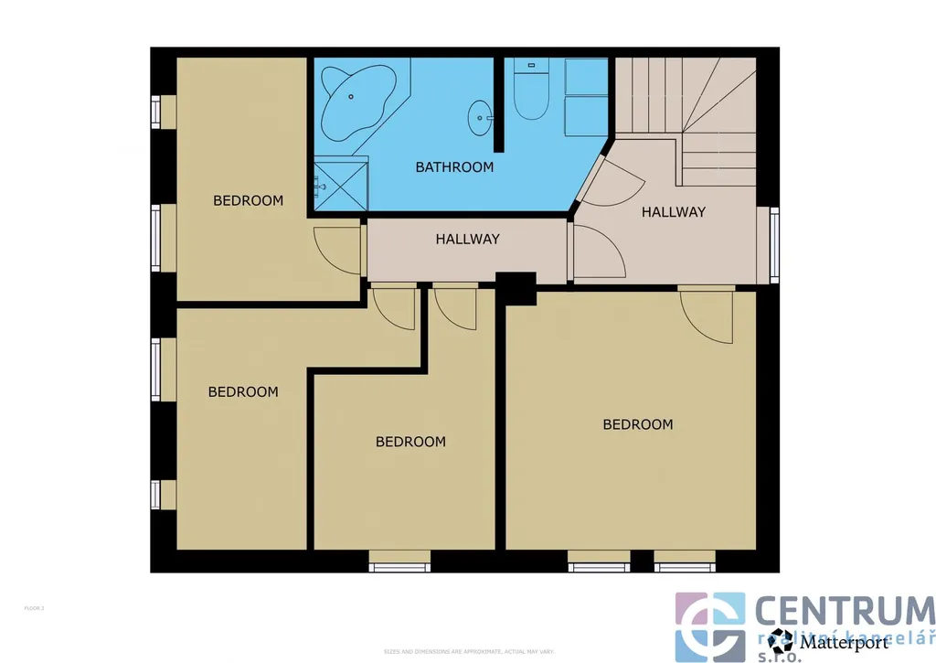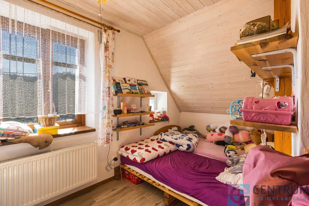 Spodní podlaží tvoří prostorný obývací pokoj s kuchyňským koutem a francouzským oknem, umožňující přímý vstup na zahradu. Dále zde nalezneme prostornou ložnici a wc. V patře se pak nachází další prostorná ložnice a tři menší dětské pokoje - tyto lze v případě potřeby jednoduše propojit. Ke skladování slouží sklep a půda.