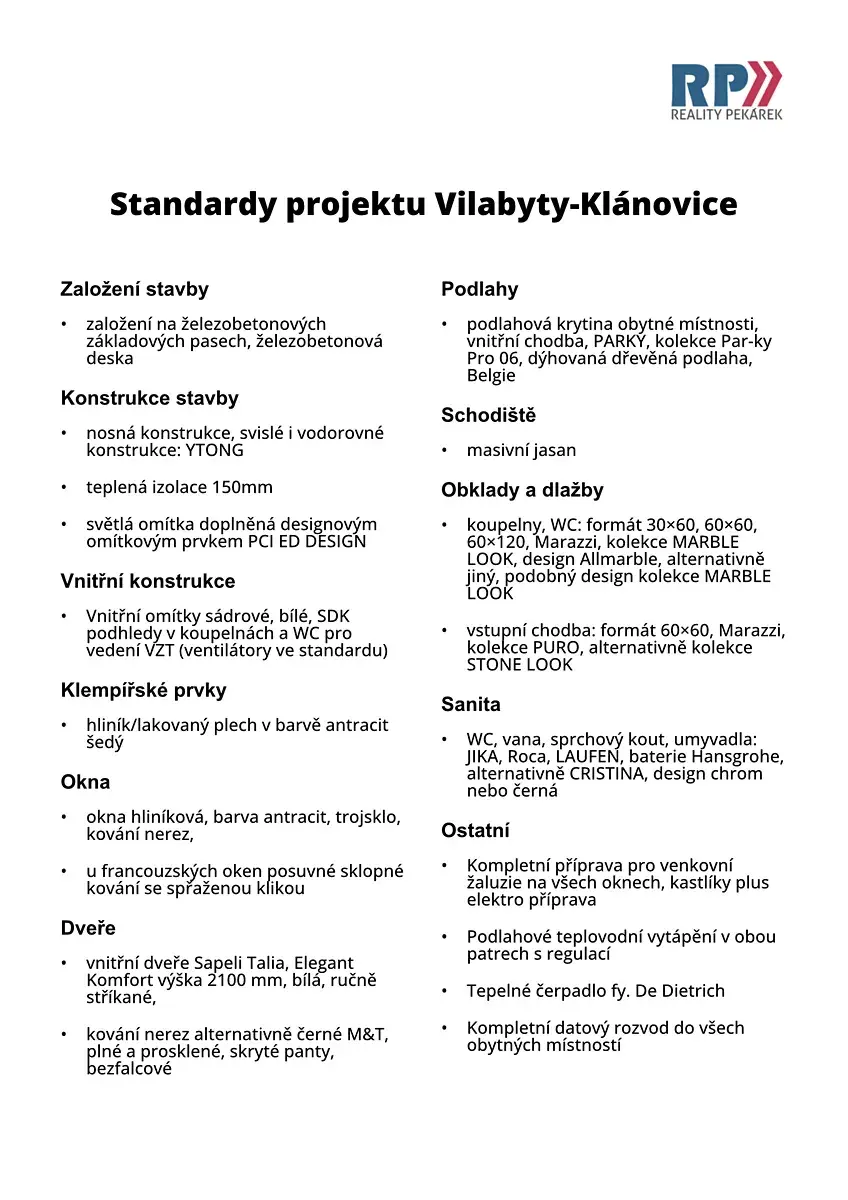 Inzerovaný vilabyt je označen písmenem B na situačním plánku v obrázkové části inzerce. Jsou zde rovněž uvedeny půdorysy obou podlaží + virtuální prohlídka matterport + přehled standardů použitých materiálů. Tepelné čerpadlo pro vytápění a ohřev TUV, dřevěné podlahy, špičková sanitární technika, kvalitní dlažby a obklady, dálkové ovládání vjezdové brány, pohodlné parkování, ale především vynikající lokalizace nemovitosti v blízkosti vlakového nádraží Praha-Klánovice činí tuto nabídku mimořádně atraktivní. Nemovitost byla zkolaudována v listopadu 2023.