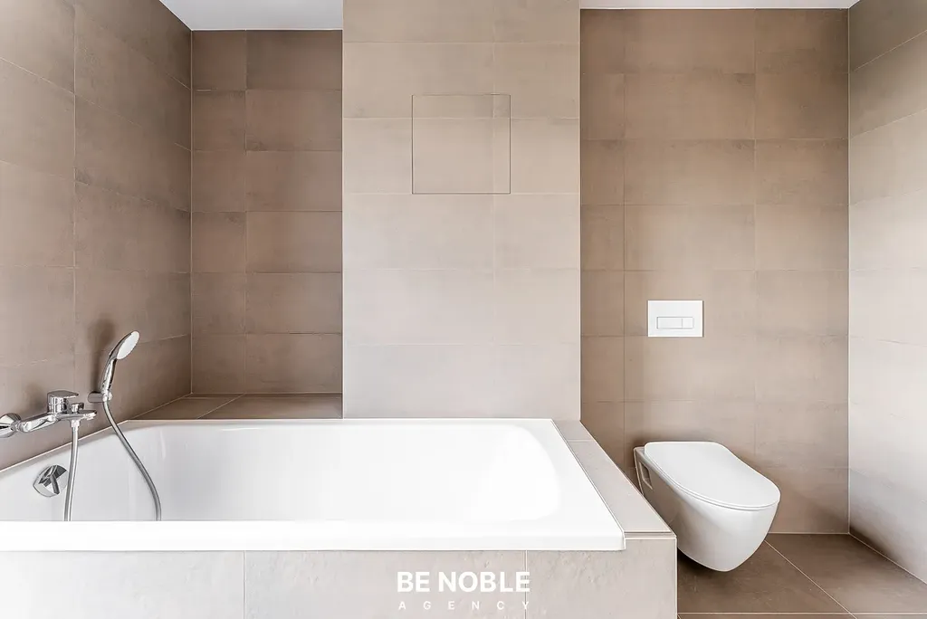 Koupelna s vanou (6,9 m²), oddělené WC (1,6 m²) a komora s místem pro pračku (1,9 m²) doplňují komfort bytu. Součástí je také vysoký standard provedení včetně přípravy pro venkovní žaluzie.