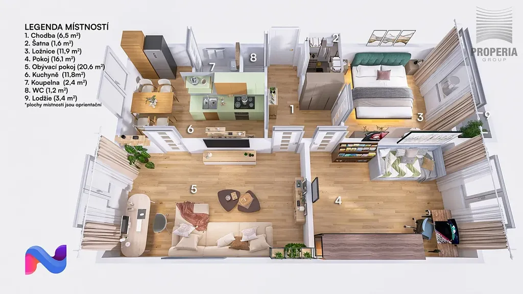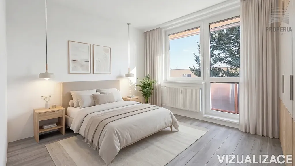 Dispozice bytu je přehledná a dobře čitelná. Dvě ložnice jsou orientovány na jižní stranu, přičemž z jedné z nich je vstup na lodžii, která přináší příjemný kontakt s venkovním prostorem a dostatek denního světla. Kuchyně spolu s obývacím pokojem směřují na sever a zajišťují příjemné klima v obytné části bytu.