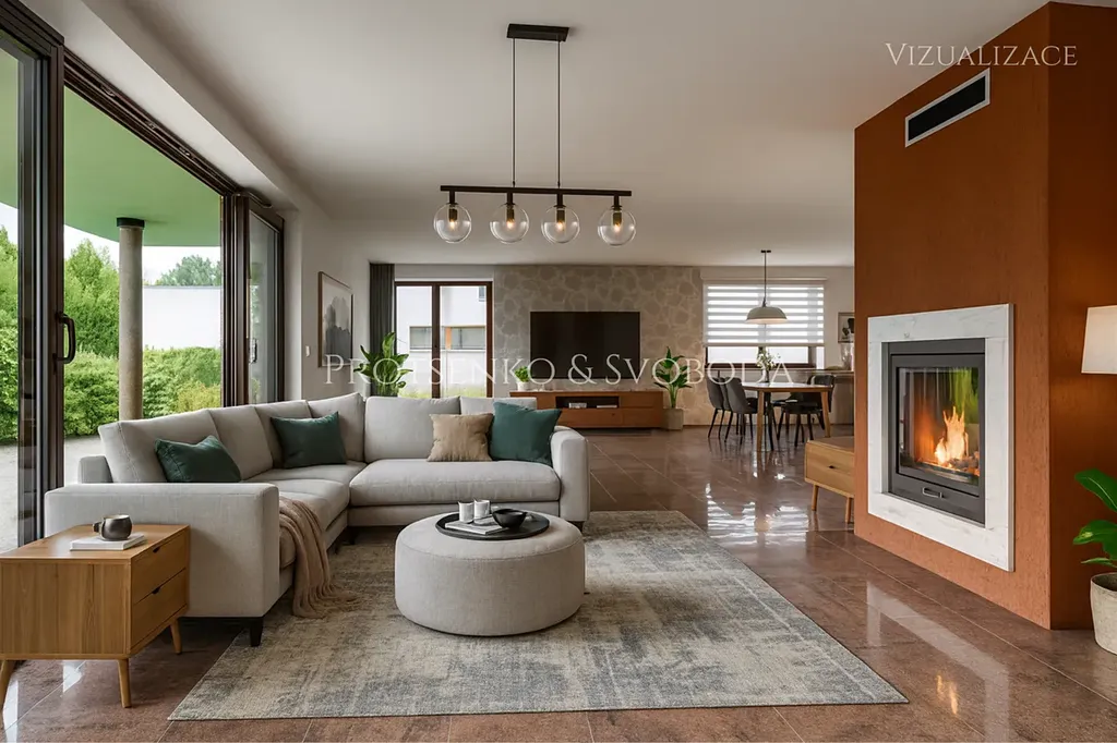• Topení: tepelné čerpadlo (hlavní zdroj), krbová vložka s napojením na bojler a solární ohřev vody.