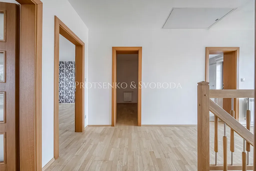 Tři prostorné pokoje (ve dvou jsou vestavěné skříně), samostatná šatna/pracovna a velká koupelna s rohovou vanou, sprchovým koutem, dvěma umyvadly, WC a bidetem. Podlahy jsou plovoucí dřevěné, vytápění je zajištěno hliníkovými radiátory. Z chodby je vstup na střešní terasu (65 m²), která navazuje na balkon (21 m²) orientovaný na jih.