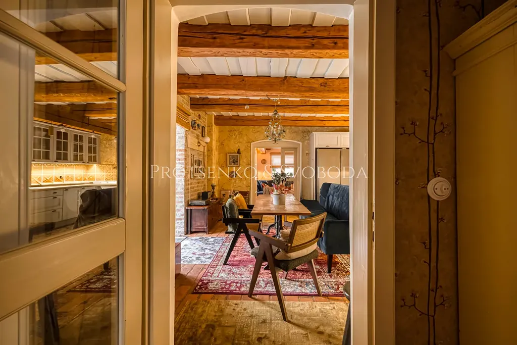 Zachované původní trámy, masivní dřevo, přirozené materiály, ruční detaily a světlo, které prostupuje každým koutem. Interiér je promyšlený do posledního detailu – propojuje historický charakter s komfortem moderního bydlení.
