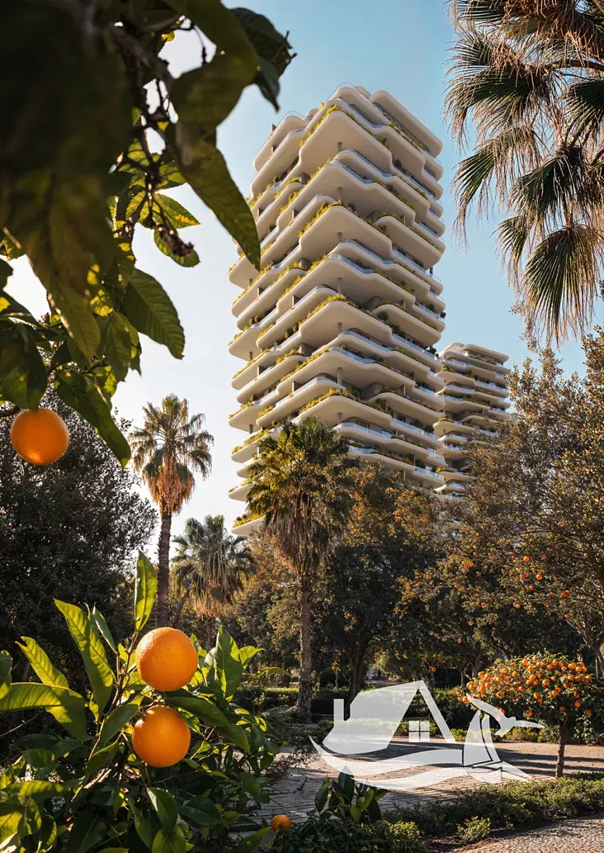 Zeleň není jen okolo budov, ale přechází i do fasád a společných podií. Výsledkem je dojem, že budovy „rostou ze země“ a jsou formované mořem a větrem.
