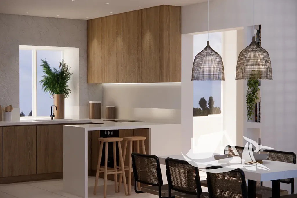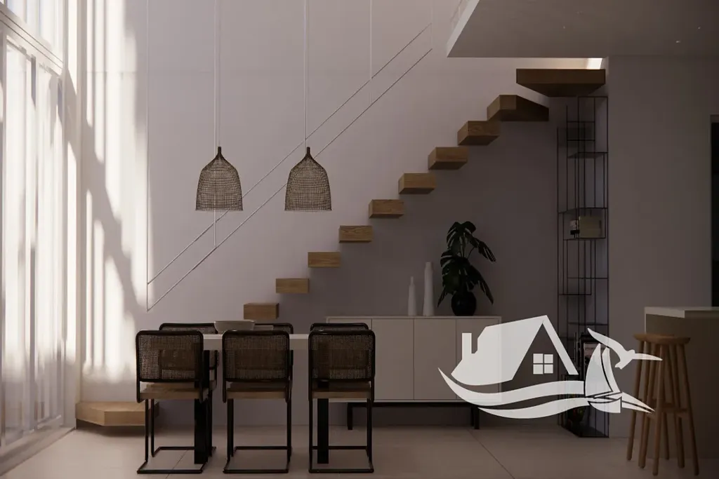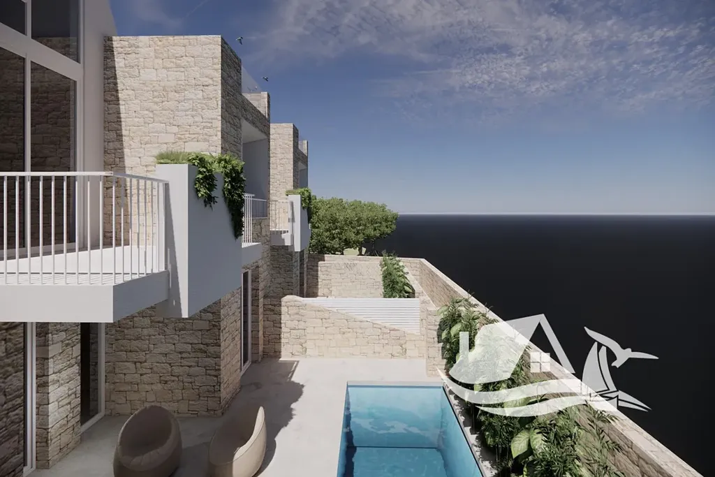 Přízemí nabízí přímý vstup na soukromé patio a zahradu, ideální pro ranní kávu či večerní relaxaci. První patro zahrnuje elegantní obývací prostor se vstupem na dvě soukromé terasy, plně vybavenou otevřenou kuchyni a koupelnu. Vzdušný mezanin, propojený plovoucím schodištěm, nabízí panoramatický výhled na moře a přístup na prostornou střešní terasu, ideální pro posezení při západu slunce.