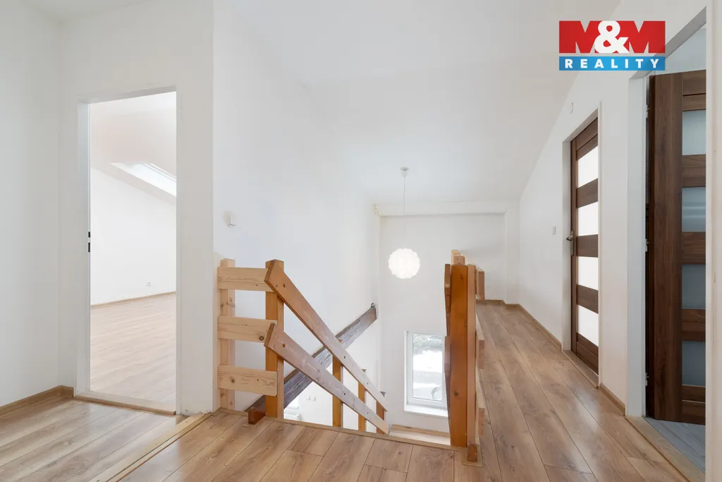 Podkroví je řešeno jako klidová zóna s ložnicí s vestavěnou skříní, samostatnou šatnou, dětským pokojem a hlavní koupelnou, což vytváří plnohodnotné a komfortní zázemí pro rodinu i náročné páry.