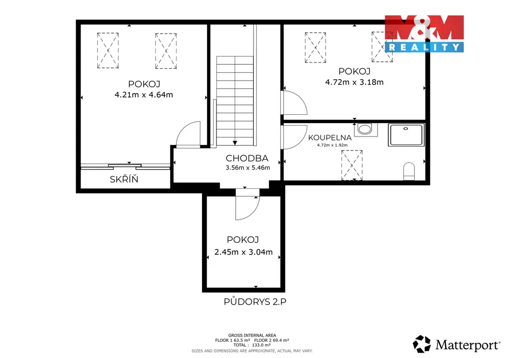 Podkroví je řešeno jako klidová zóna s ložnicí s vestavěnou skříní, samostatnou šatnou, dětským pokojem a hlavní koupelnou, což vytváří plnohodnotné a komfortní zázemí pro rodinu i náročné páry.
