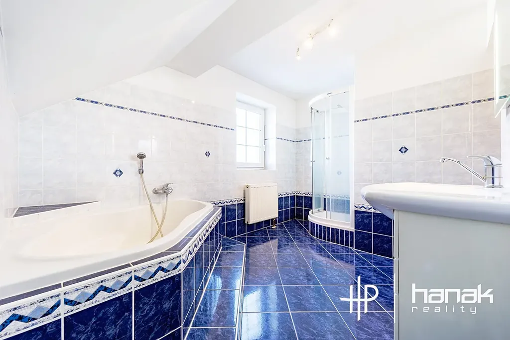 V prvním patře se nachází tři prostorné ložnice, balkon, pracovna, oddělená toaleta a velká koupelna s vanou, sprchovým koutem a umyvadlem.