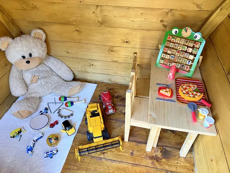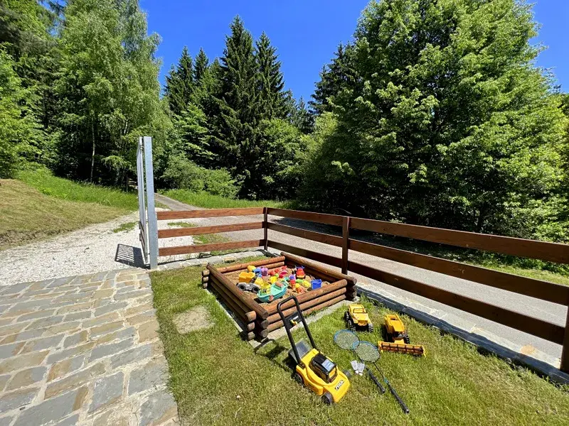 Samozřejmostí je WIFI připojení v celém prostoru domu i zahrady. Zahrada je uzavřena oplocením s řadou dětských prvků jako skluzavka, pískoviště, dětský domeček Medvídek Pú. Kolem objektu se nachází srovnaný pozemek s udržovaným trávníkem. Na svažitých částek pozemku jsou vysázeny trvanlivé kvetoucí keřové porosty. Příjezd k domu je po veřejné asfaltové komunikaci. Před objektem se nachází 4 parkovací místa. Další 2 je možno využít na vlastním pozemku.