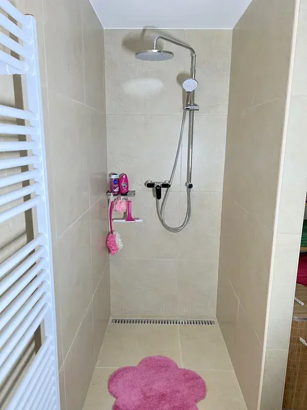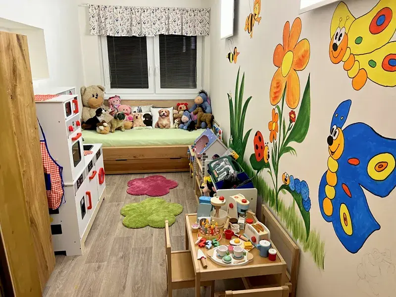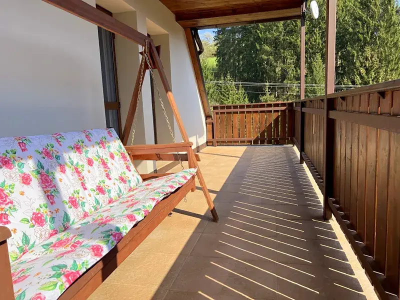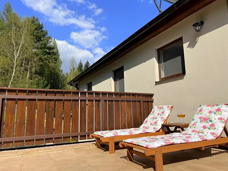 1. patro: chodba, koupelna se sprchovým koutem, umyvadlem a WC, 3x pokoj, všechny pokoje jsou neprůchozí: největší pokoj s balkonem k lesu, 2x dvojlůžko, 1x jednolůžko, prostorná skříň, menší pokoj 1x dvojlůžko, skříň, další pokoj 1x dvojlůžko, skříň, postýlka. Má samostatný vchod na prostornou terasu (40 m2) s masivní houpačkou a lehátky.