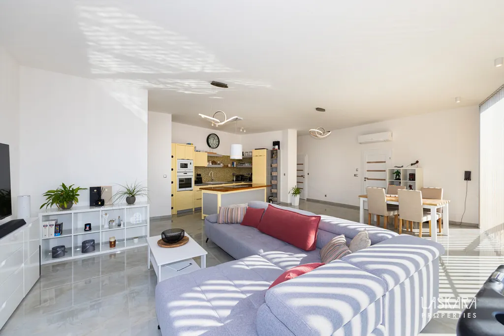 Součástí obývacího prostoru je designová kuchyňská linka s vestavěnými spotřebiči a masivní pracovní deskou, která se stává přirozeným centrem domácnosti.