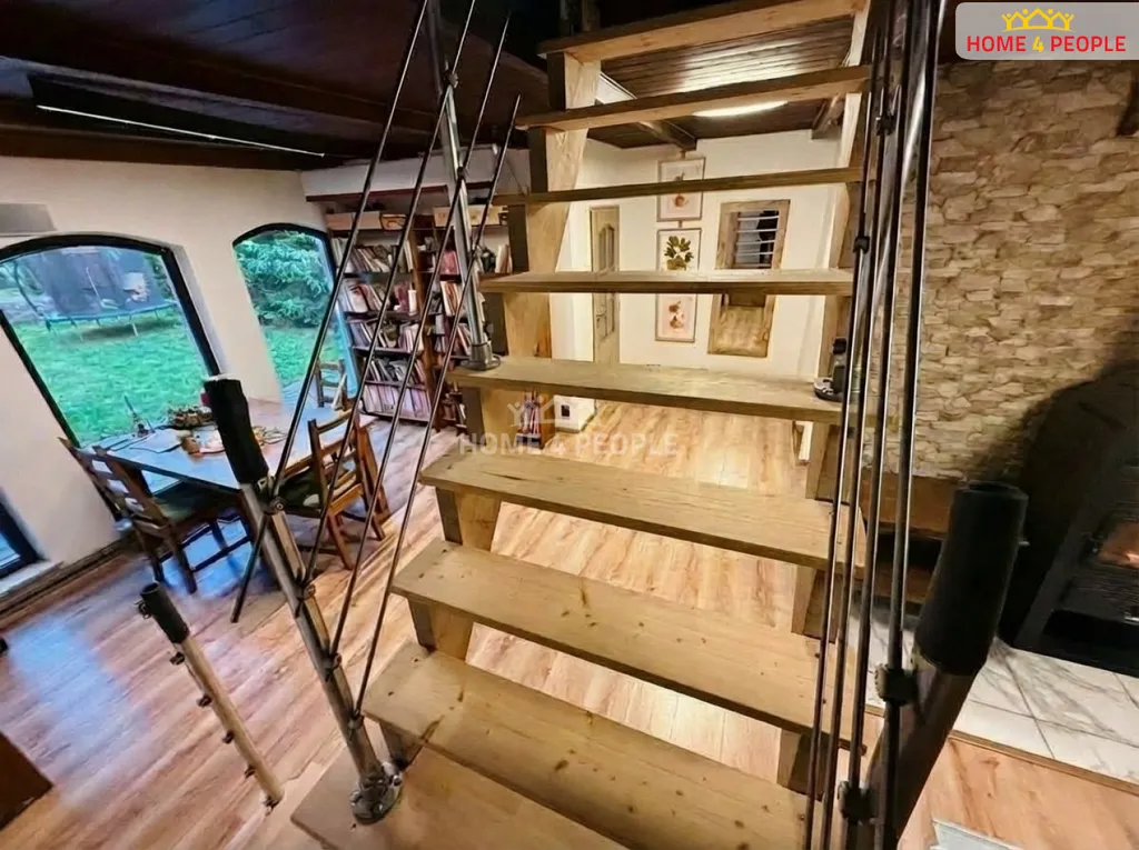 V přízemí domu najdeme druhý vchod do hlavní části domu, kde se nachází vstupní předsíň, dále prostorný a útulný obývací pokoj s kuchyní a také druhá koupelna se sprchovým koutem + WC. Větší komfort obývacího pokoje zajišťuje balkon, který poskytuje výhled do zadní části zahrady. Dřevěné schody dále vedou do 1. patra, kde najdeme další 2 podkrovní pokoje, každý se svým balkonem.
