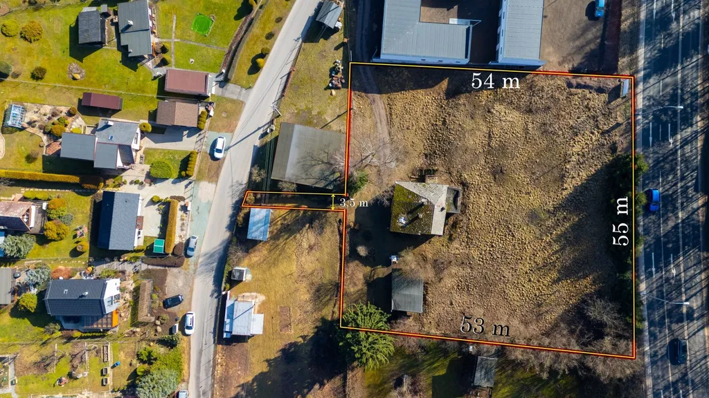 Pozemek má téměř čtvercový tvar o přibližných rozměrech cca 54 × 53 m, což umožňuje velmi efektivní využití plochy například pro výstavbu výrobní nebo skladové haly s potřebným zázemím.