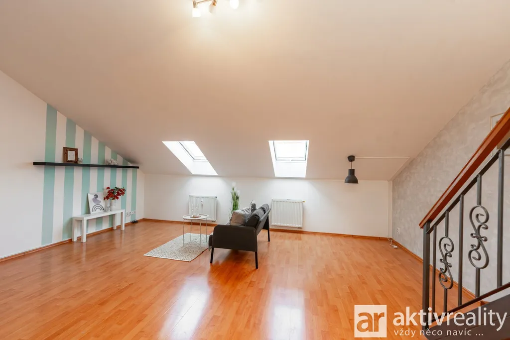 Horní mezonetové patro nabízí dostatek prostoru pro ložnici, pracovnu nebo relaxační zónu. Díky dispozici bytu je zde přirozeně oddělena denní a noční část, což zvyšuje komfort bydlení i soukromí. Podkrovní charakter bytu doplňují střešní okna, která zajišťují dostatek přirozeného světla během celého dne a dodávají interiéru příjemnou atmosféru.