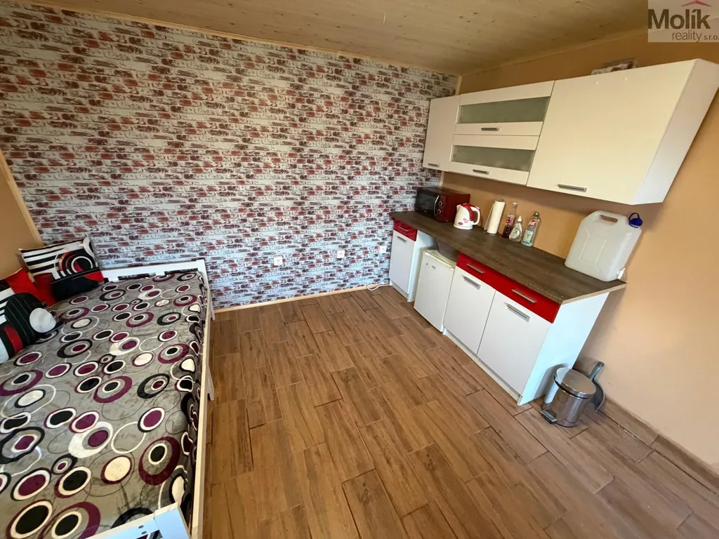 Chata nabízí útulný interiér s kuchyňskou linkou a prostorem na spaní se zavedenou elektřinou.