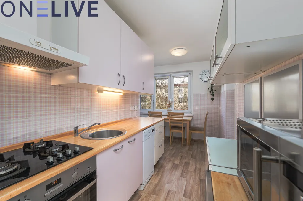 Dispozici tvoří tři samostatné pokoje a prostorná kuchyně s jídelním koutem, která nabízí dostatek místa pro každodenní rodinný život. Výhodou je zděné bytové jádro.