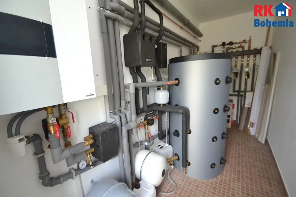 Vytápění domu vlastním plynovým kotlem, umístěným v technické místnosti nacházející se v přízemí domu. Plynový centrální kotel slouží pro ohřev teplovodního podlahového topení. Teplá voda bude ohřívána solárními panely ve velkém zásobníku na TUV s plynovým dohřevem. Vlastní měření pro každý byt.