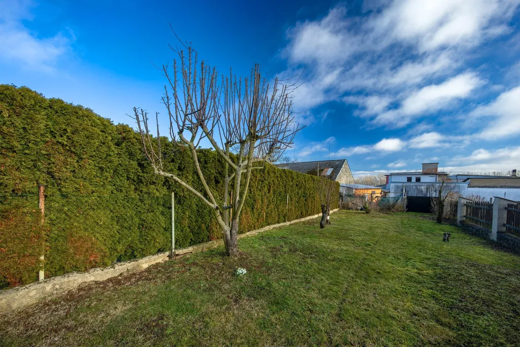 Celková plocha parcel 823 m². Napojení na všechny obecní sítě — plyn, voda, kanalizace, elektřina. Centrální plynový kotel. Zahrada využívaná nájemníky. Vjezd na pozemek.