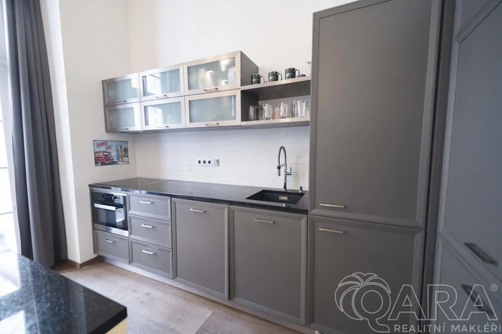 Nabízím k prodeji velice luxusní mezonetový byt o velikosti 2+1 s terasou s celkovou plochou bytu 62,82m2 + 25,67m2 terasa. Jedná se o designový byt v domě po kompletní rekonstukci v samotném centru Prahy v ulici Soukenická v těsném sousedství Náměstí Republiky. Byt je rozložen do dvou hlavních podlaží. Na hlavním podlaží je obývací pokoj s kuchyní a terasou orientovanou do vnitrobloku, kde můžete v klidu posedět nebo si užít grilování. Dále je zde samostatná toaleta. Točitým schodištěm se dostaneme do pracovny na niž navazuje ložnice a koupelna se sprchovým sprchový koutem, WC. Vysoké stropy a okna působí velmi přijemně a umocňují milý pocit celého interiéru. Dřevěné podlahy jsou z kartáčovaného olejovaného dubu. V koupelně je na podlaze dlažba a mozaika z mramoru, povrch stěn je z italského umělého kamene Quarella. Kuchyňská linka je vybavena žulovou pracovní deskou a spotřebiči Miele a Siemens.