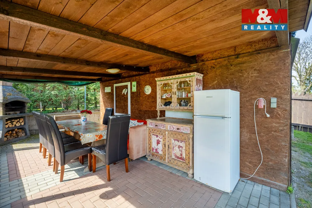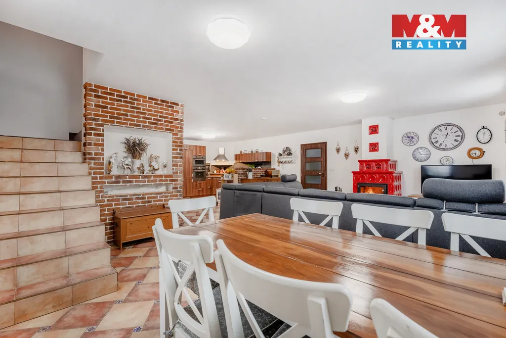 Na zahradě najdete bazén, pergolu s posezením a dostatek prostoru pro relax i rodinné aktivity. Uvnitř oceníte podlahové vytápění a kachlová kamna, která dodávají domu příjemnou atmosféru po celý rok.