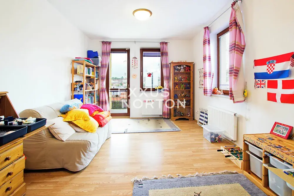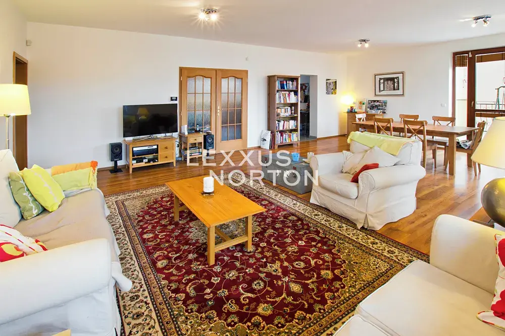 Dispozice bytu nabízí prostorný obývací pokoj, čtyři ložnice, jídelní část s plně vybavenou kuchyní a tři koupelny. K bytu dále náleží terasa o velikosti 45 m2 se zatravněnou plochou. V ceně nájmu je zahrnut sklep a jedno garážové stání, druhé garážové stání je k dispozici po dohodě.