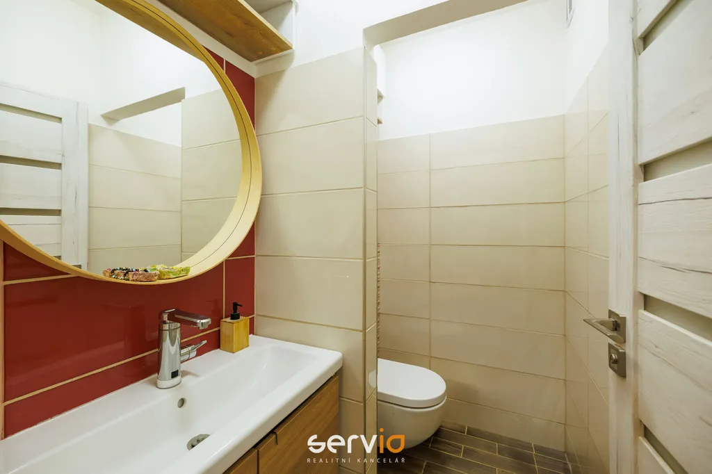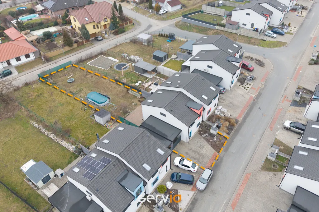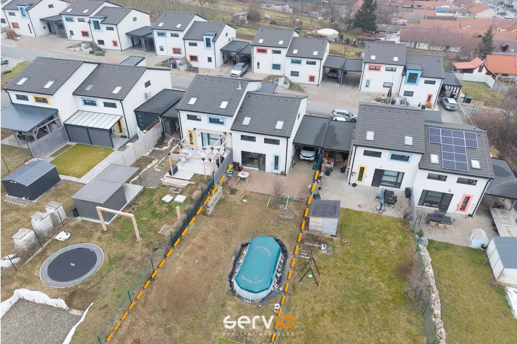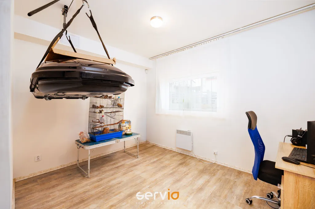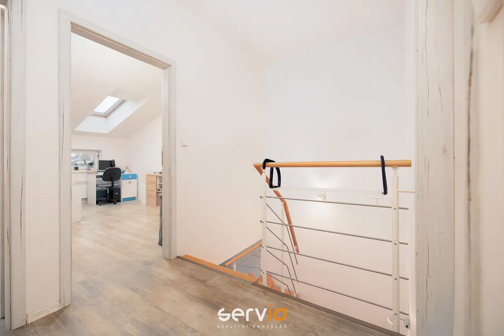 Jedná se o patrový dům o 2.NP v blokové zástavbě rodinných domů mimo hlavní ulici. V přízemí se nachází obývací pokoj s kuchyňským koutem, vstupem na zahradu s terasou, pracovna a WC. V patře zbývající 4 pokoje a koupelna s vanou a WC. Možnost parkovaní na vlastním pozemku až pro 3 auta, z toho 1 kryté za uzamykatelnou bránou.