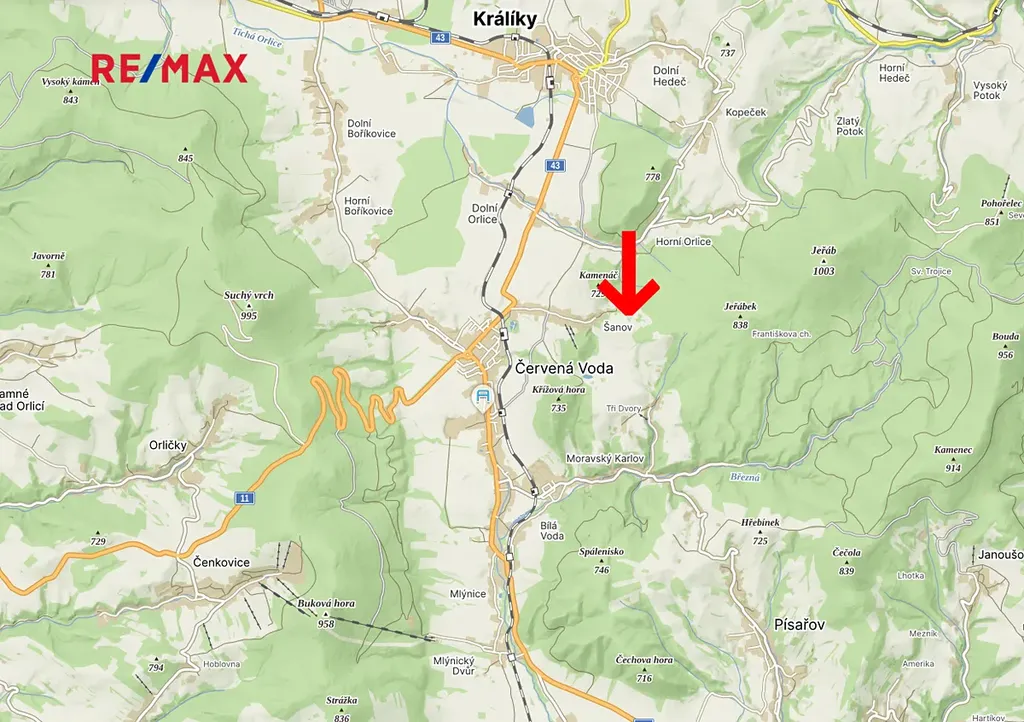 Nabízíme k prodeji pozemek určený k bydlení v části obce Šanov u Červené Vody, obec Červená Voda, okres Ústí nad Orlicí. Pozemek o celkové výměře 1 745 m² se nachází v klidné, mírně svažité lokalitě s výhledy do okolních lesů a horských hřebenů.