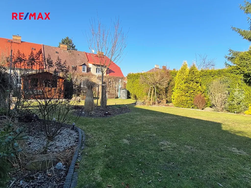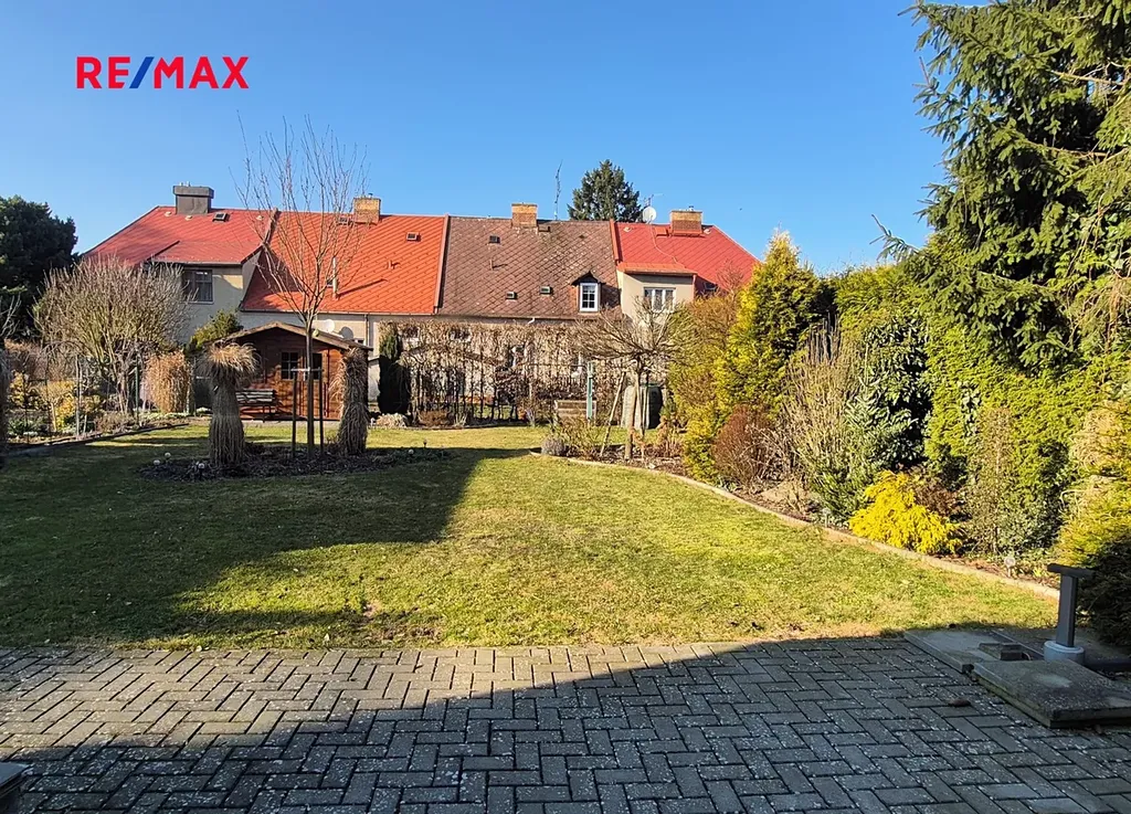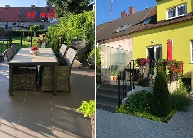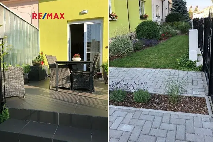 Terasa a část kolem domu je vydlážděná. Před domem je malá okrasná předzahrádka, vzadu za domem zahrada o výměře 284 m2 s dřevěným zahradním domkem, vydlážděná část má výměru 27 m2.