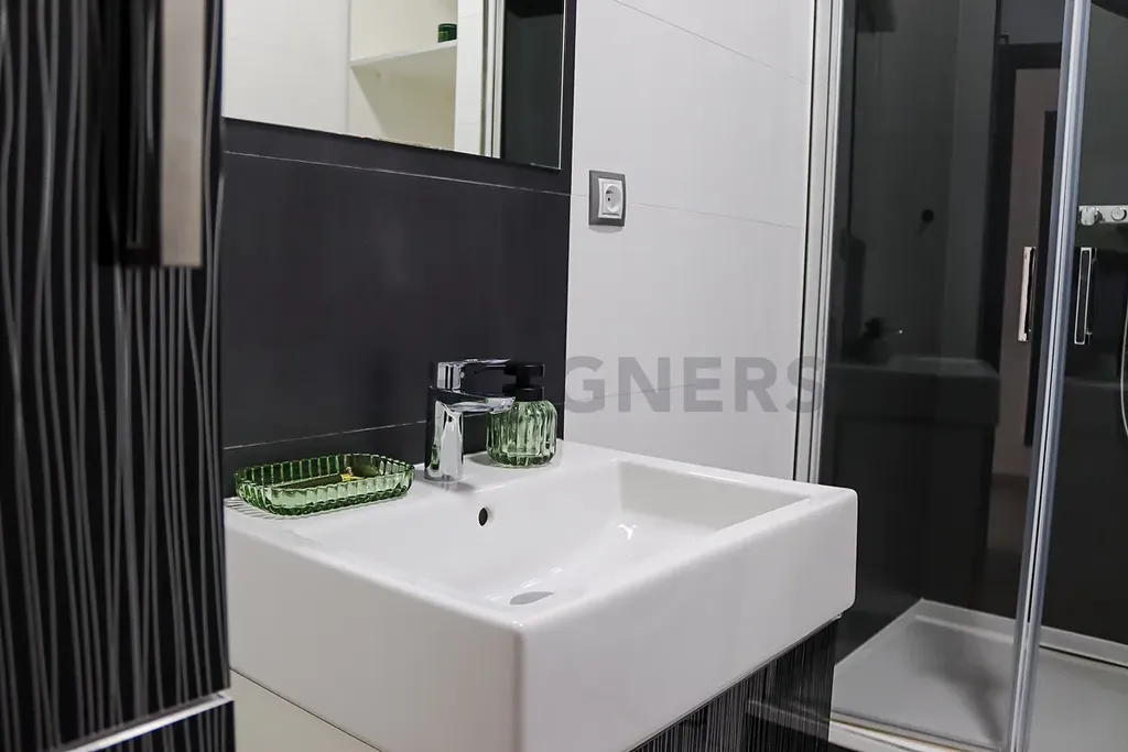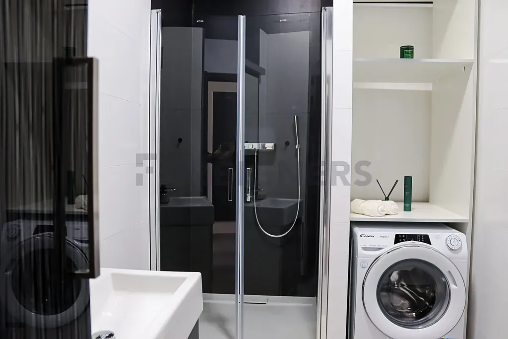 Byt se nabízí částečně vybavený, kde kuchyňská linka disponuje moderními spotřebiči jako je sporák, trouba, mikrovlnka, lednička s mrazničkou, digestoř, klimatizace. V koupelně najdete umyvadlo, toaletu, sprchový kout a pračku. Ve vstupní chodbě je velká vestavěná skříň. Majitel je ochoten byt dovybavit po dohodě.