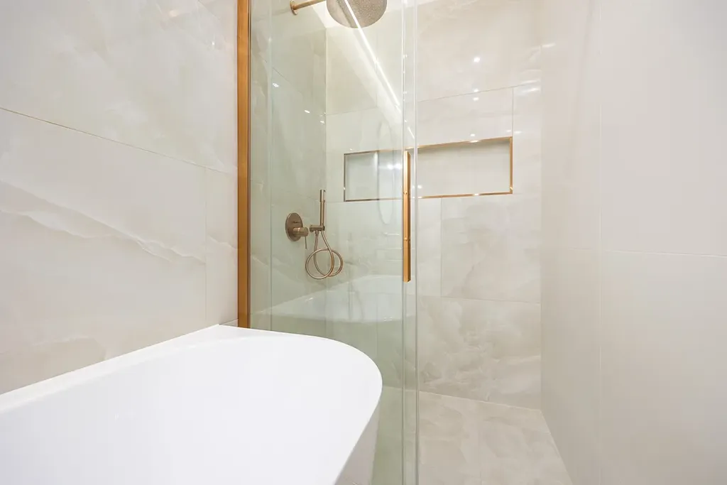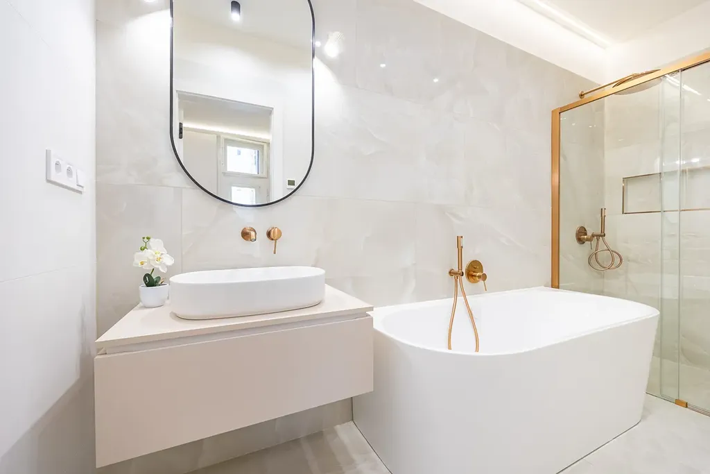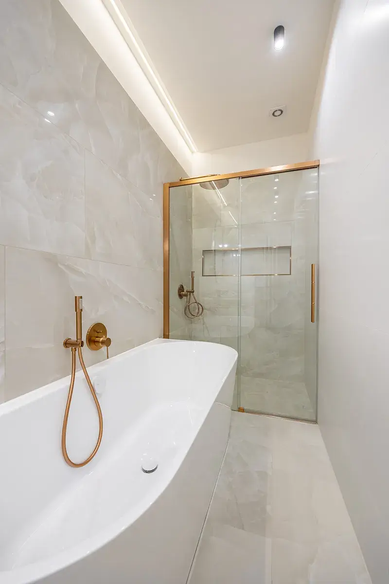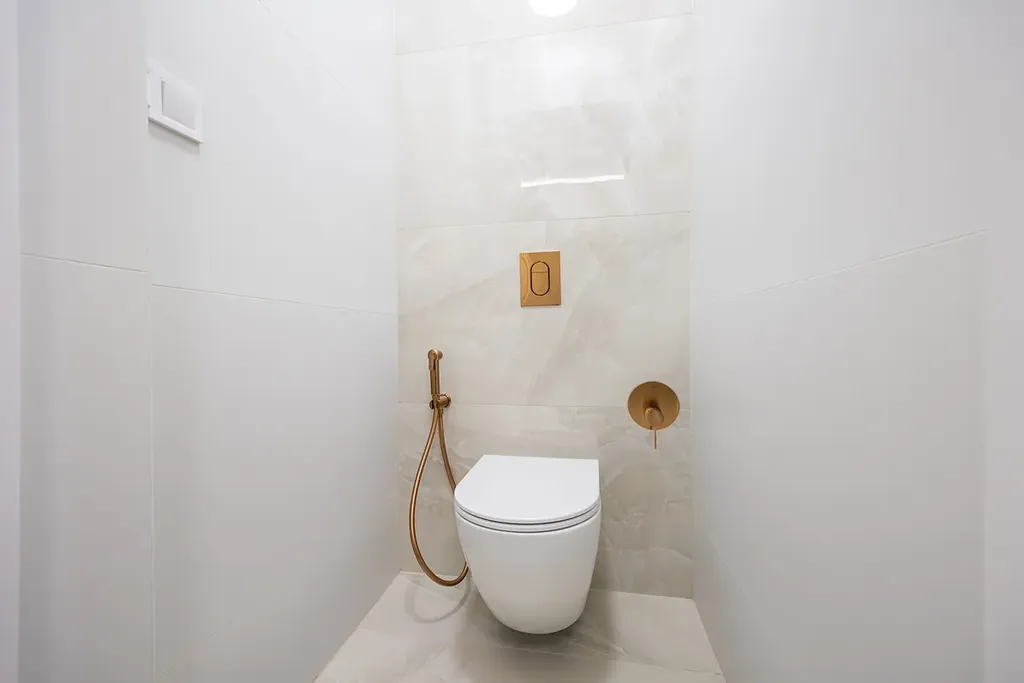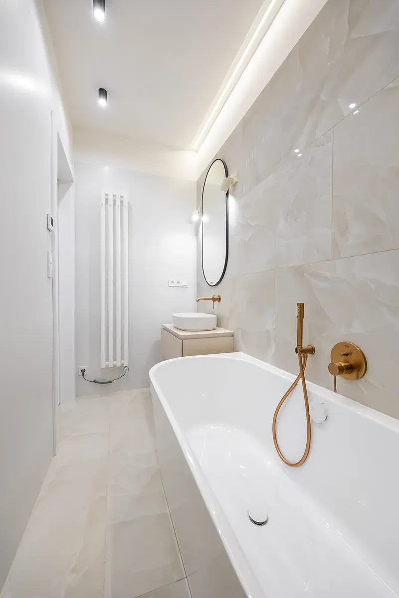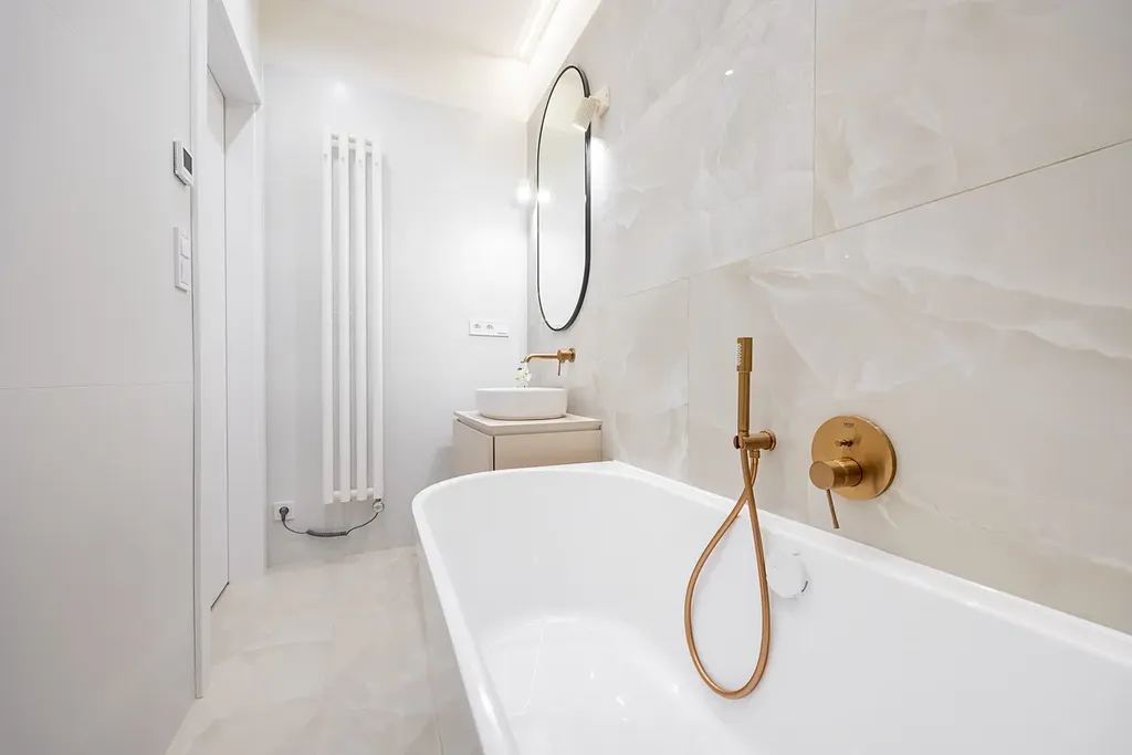Koupelna je vybavena luxusní přisazenou vanou, sprchovým koutem s nikou a designovým umyvadlem na skříňce. O teplo se postará topný žebřík a podlahové vytápění. Všechny baterie jsou podomítkové značky Grohe. Samostatná toaleta je také vybavena bidetovou sprchou s podomítkovou baterií.
