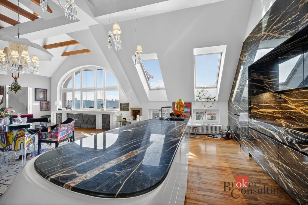Součástí obývacího prostoru je exkluzivní kuchyňská linka na míru, kompletně provedená v mramoru a vybavená špičkovými spotřebiči značky Gaggenau. Kuchyně byla realizována v hodnotě několika milionů korun a představuje výrazný designový prvek celého interiéru.