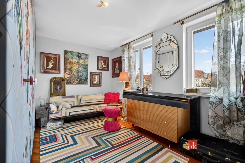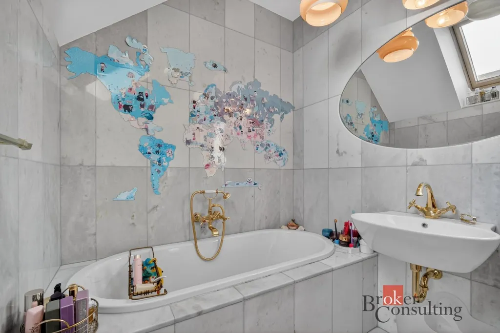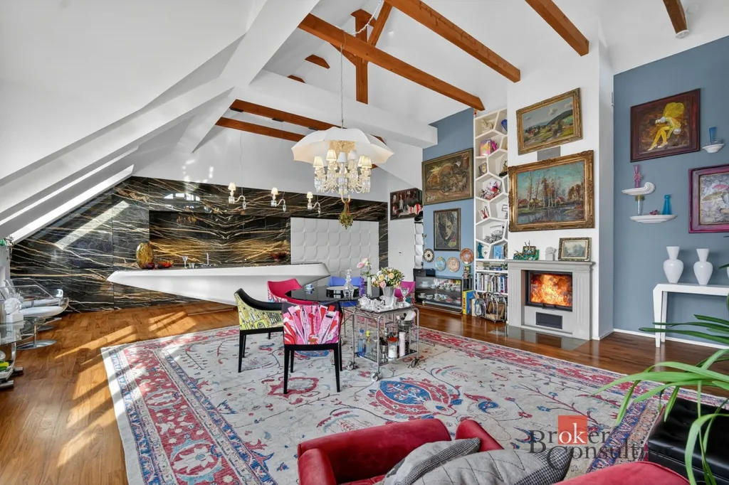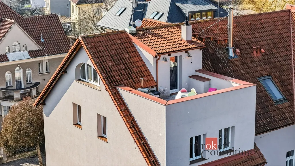 Byt zabírá celé horní patro a podkroví elegantní vily, což přináší nejen dostatek soukromí, ale také atmosféru bydlení, která se blíží rodinnému domu.