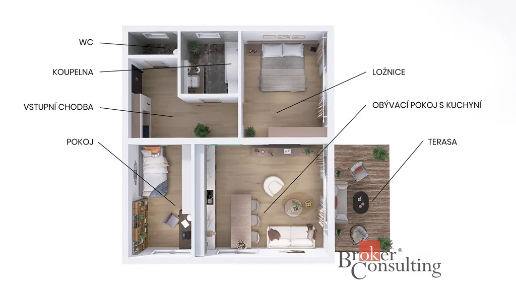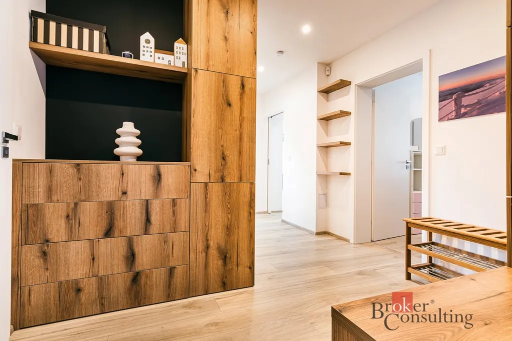 Byt tvoří obývací pokoj s kuchyňským koutem a vstupem na zahradu (HS portál), ložnice, dětský pokoj, koupelna a samostatné WC. V celém bytě je instalovánopodlahové vytápění, které zajišťuje příjemný tepelný komfort. Byt je vybaven kuchyňskou linkou a nábytkem na míru, který je součástí prodeje.