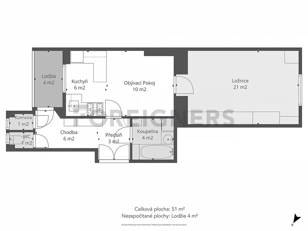 Součástí bytu je také menší balkon orientovaný do klidného vnitrobloku, stejným směrem (severovýchod) jsou orientována i okna kuchyně. Okna ložnice směřují na jihozápad do ulice 5. května.
