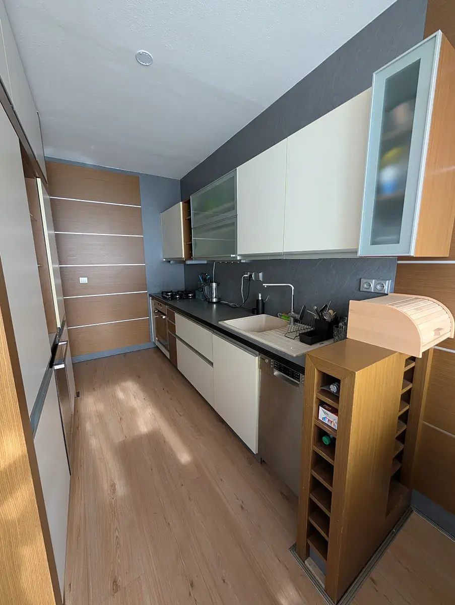 Kuchyňský kout je vybaven kuchyňskou linkou se spotřebiči, plynovým sporákem, troubou, myčkou, digestoří a úložnými skříňkami, chladničkou pro vína. Vstupní chodba nabízí místo pro skříně a další úložné řešení. Byt je ve vynikajícím stavu s nábytkem na míru