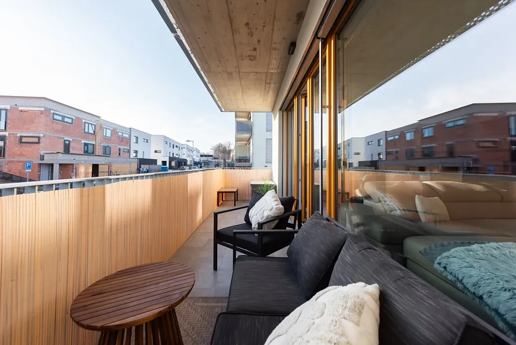 Srdcem bytu je velký obývací pokoj (32m2) s plně vybavenou kuchyňskou linkou s dostatkem pracovní plochy a kvalitními spotřebiči, vestavěným úložným prostorem a vstupem na západně orientovaný balkon (10m2). Balkon je dostatečně prostorný pro rodinné posezení, určitě na něm zvládnete taktéž i menší grilování či vypěstovat spoustu bylinek.