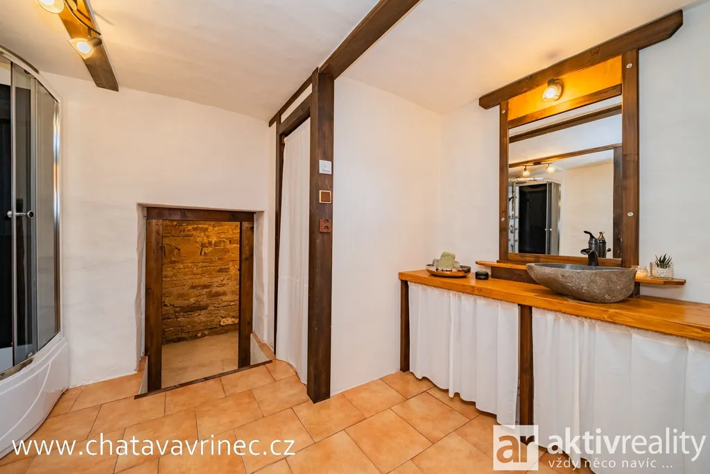 Suterén (26 m2) : koupelna se sprchovým koutem, toaletou, přípojkou na pračku a bojlerem. Odtud vstup do kamenného sklepa – ideální pro vinný sklípek či saunu.