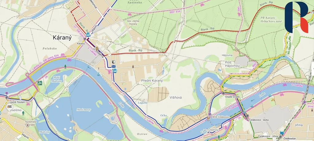 Investiční pozemky Káraný – 12 529 m² u soutoku Labe a Jizery, okres Praha-východ.