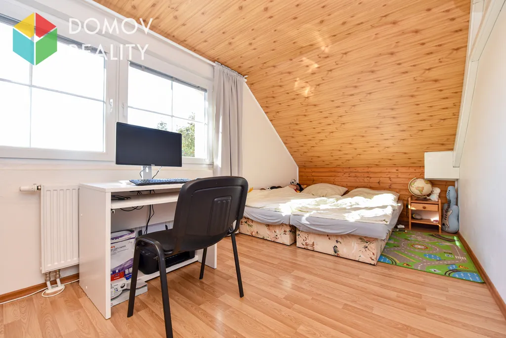 Do patra domu se dostanete po dřevěném točitém schodišti, kde je zároveň vytvořen zajímavý knihovní prostor. V patře jsou tři pokoje, které mohou sloužit jako ložnice, dětské pokoje nebo pracovna. Pokoje jsou částečně vybaveny, ve všech se nachází postele.