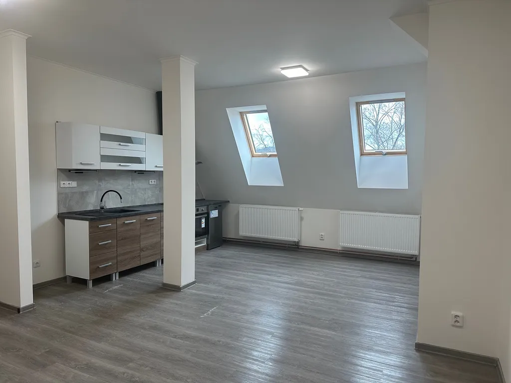 Dispozice bytu: obývací pokoj s kuchyňským koutem 30 m², - částečně zkoseno, střešní okna + sloup, průchozí pokoj 25 m² (orientace západ), koupelna s rohovou vanou / WC součástí, střešní okno; předsíň a bytová šatna. Byt je vybaven vkusnou novou kuchyňskou linkou včetně myčky, vlastní plynový kotel, přípojka na pračku, svítidla a žaluzie - vše v nové čistě bílé výmalbě. Orientace bytu: jihozápad – jihovýchod.