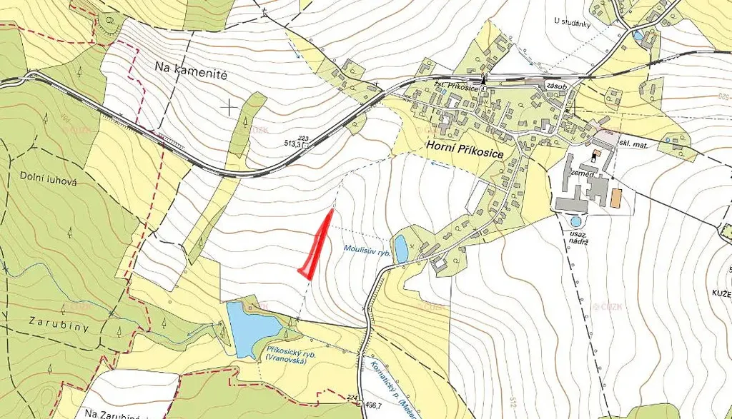 Nabízím k prodeji pozemek orné půdy a sousední vodní plochy v katastrálním území Příkosice, okres Rokycany, zapsaný na listu vlastnictví č. 494.
