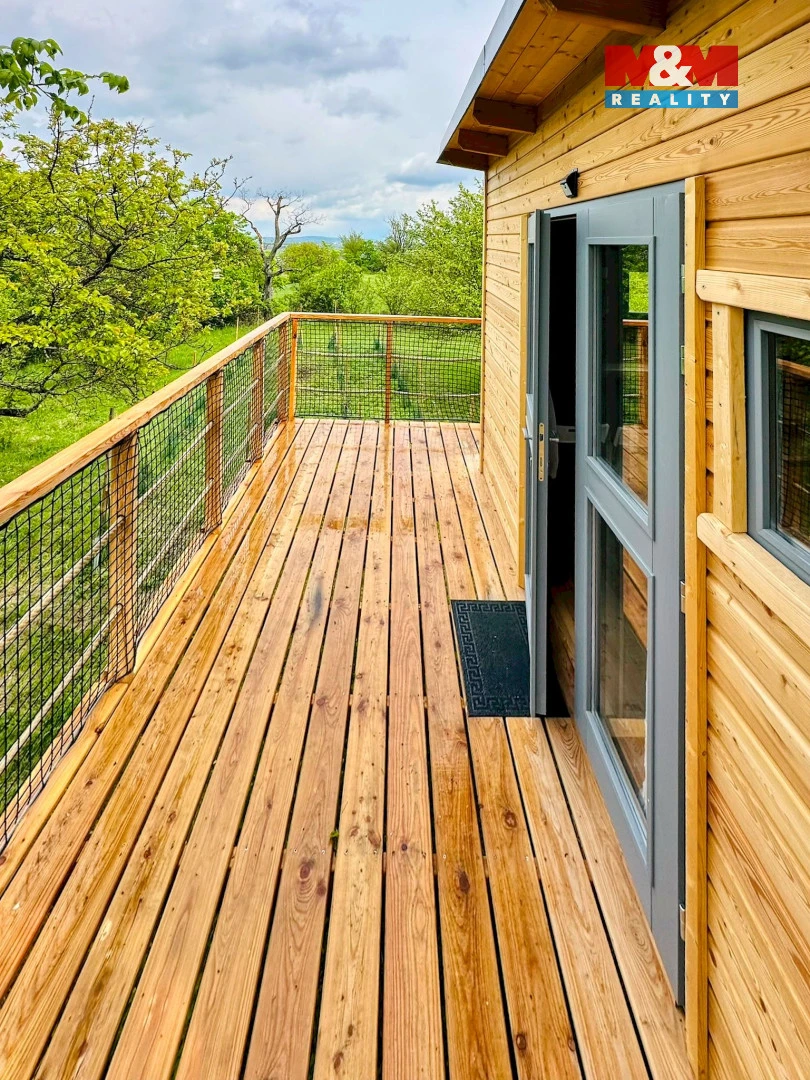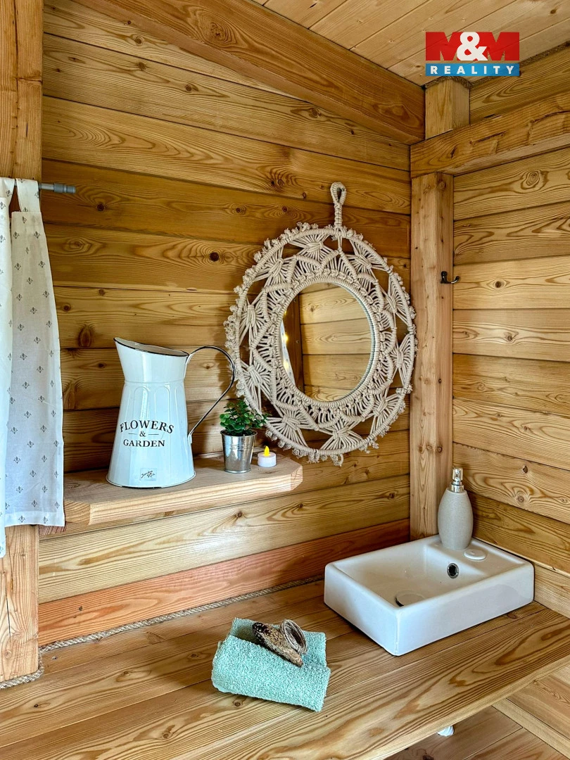 Stavba o ploše 30 m² je navržena pro pohodlný pobyt i celoroční využití. Uvnitř najdete útulný obytný prostor s dvoulůžkem, praktický kuchyňský kout, samostatnou ekologickou toaletu. Na střeše je fotovoltaický panel pro napájení LED osvětlení, varné konvice a sprchy. V chladnějších dnech oceníte samostatné bezpečné vytápění, které zajišťuje příjemné teplo.