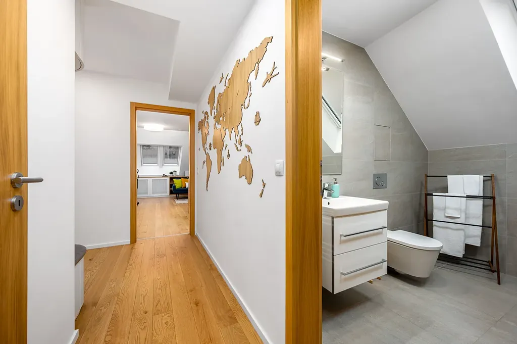 Interiér je proveden ve vysokém standardu s použitím kvalitních a nadčasových materiálů. Dřevěné podlahy v obytných místnostech a velkoformátová dlažba dodávají prostoru elegantní a reprezentativní charakter.