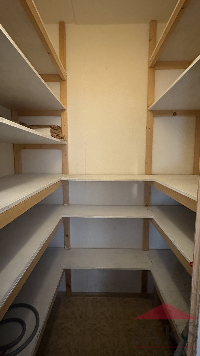 Popis: chodba, šatna s regály, zděná koupelna (sprchový kout, umyv. se zrcadlem a skříňkou, topný žebřík, pračka), samostatné WC, kuchyň (kuch. linka s plynovým sporákem s HV troubou, MV trouba, digestoř, myčka, spíží) s jídelnou (stůl se 4 židlemi), prostorný obývací pokoj (obývací stěna s TV, sedací souprava s konferenčním stolem).