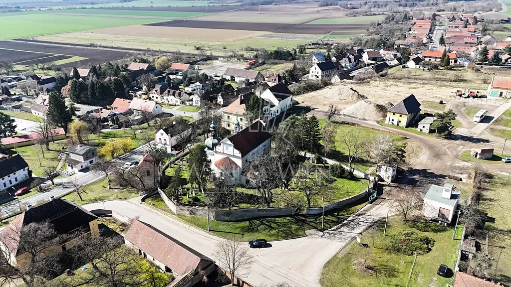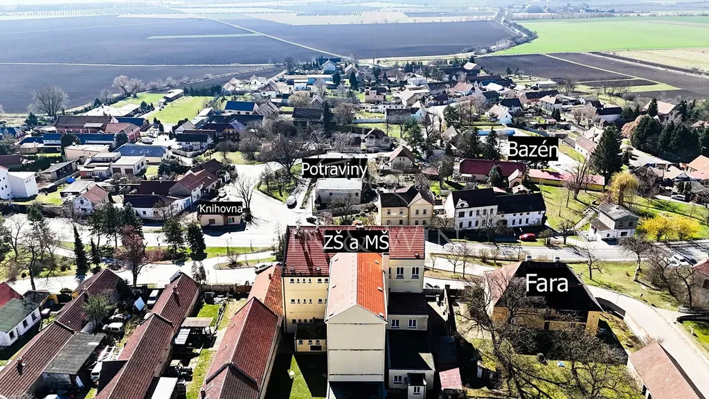 Na fotografii z dronu si navíc můžete udělat jasnou představu o reálné vzdálenosti ke škole i do obchodu, což jen potvrzuje výbornou polohu domu v rámci obce.