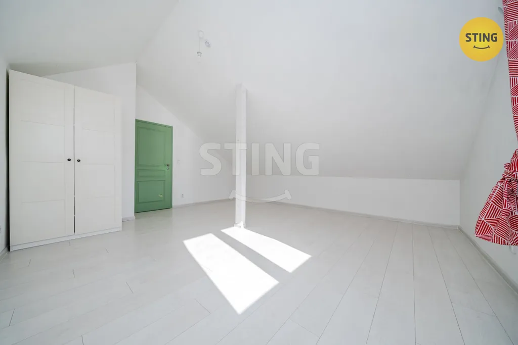 2. NP: Schodištěm (3,56 m2) vystoupáme do prostorné chodby čtvercového půdorysu (8,64 m2), z níž je vstup do šatny (6,20 m2), nad níž zaplesá srdce každé ženy, druhými dveřmi se dostaneme do slunného podkrovního dětského pokoje o výměře (18,80 m2) a třetími pak do pokoje pro hosty o výměře (14,40 m2).