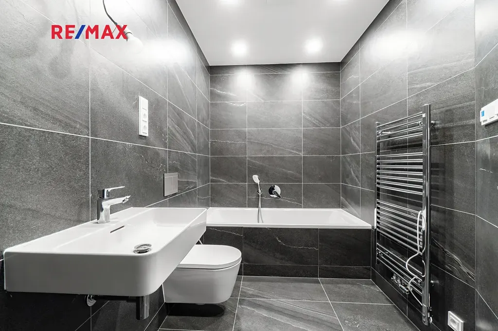 Koupelna je vybavena vanou a podlahovým vytápěním, nechybí ani přípojka na pračku.