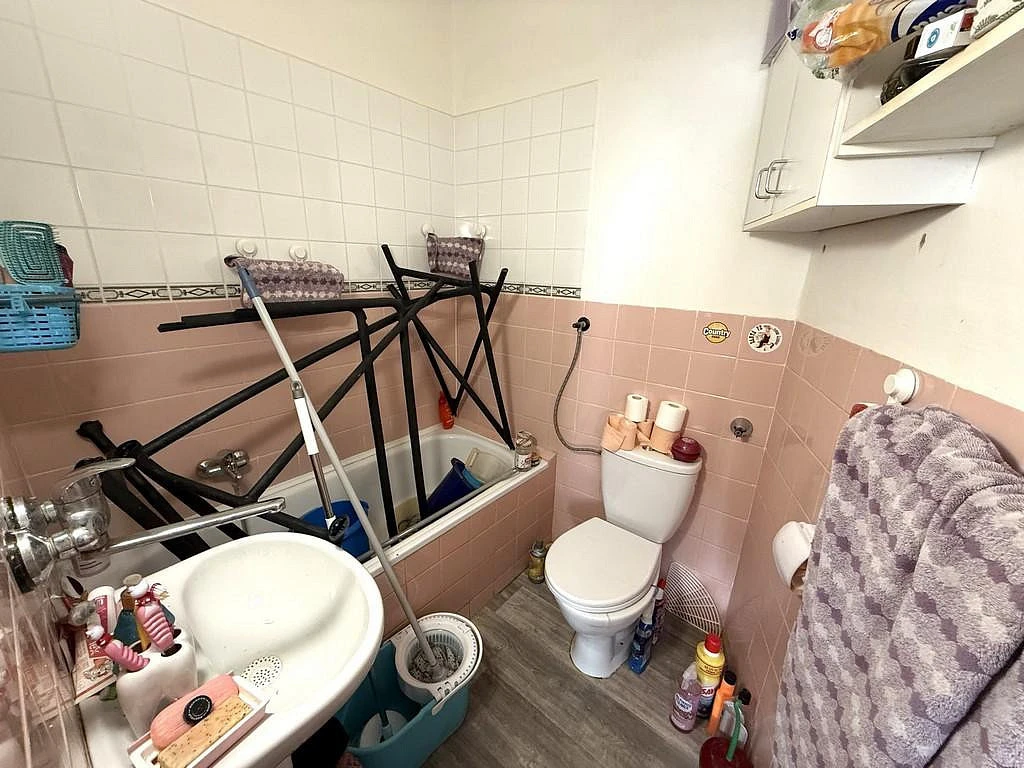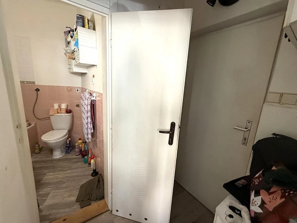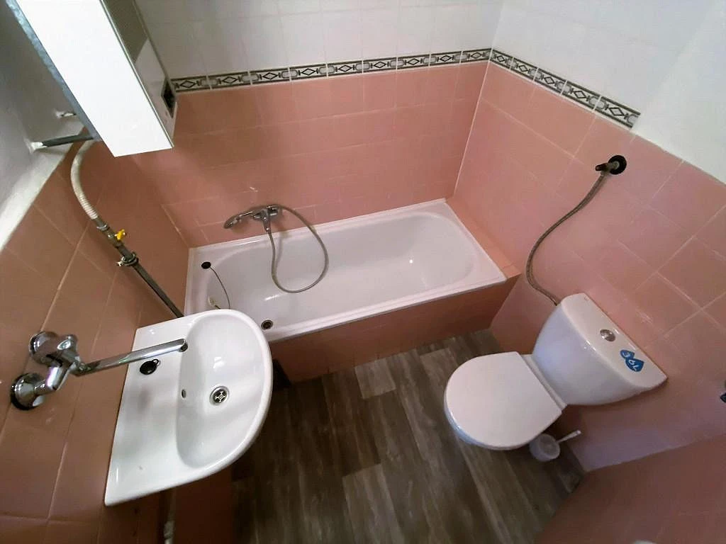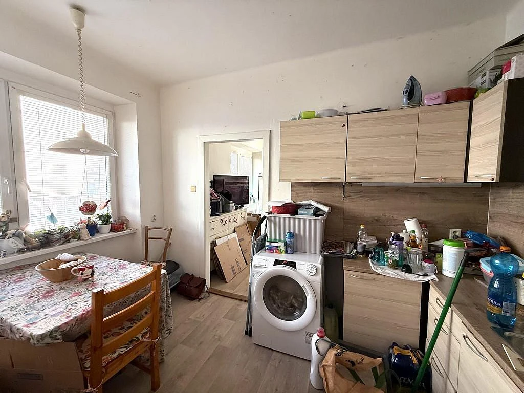 Za vstupními dveřmi se ocitneme v kuchyni o velikosti cca 12,1 m², která je vybavena kuchyňskou linkou, lednicí, mikrovlnnou troubou a sporákem. Dále se v kuchyni nachází spíž s regálem, pro úschovu například suchých potravin, spíž je o výměře cca 0,7 m². Z kuchyně je vstup do všech místností v bytě. Po pravé straně od vstupních dveří se nachází koupelna, která disponuje vanou, umyvadlem, zrcadlem, toaletou a plynovým ohřívačem. Koupelna je o velikosti cca 3,5 m². Pokoj, do kterého se taktéž vchází z kuchyně se nabízí nevybavený a je o výměře cca 16,7 m².