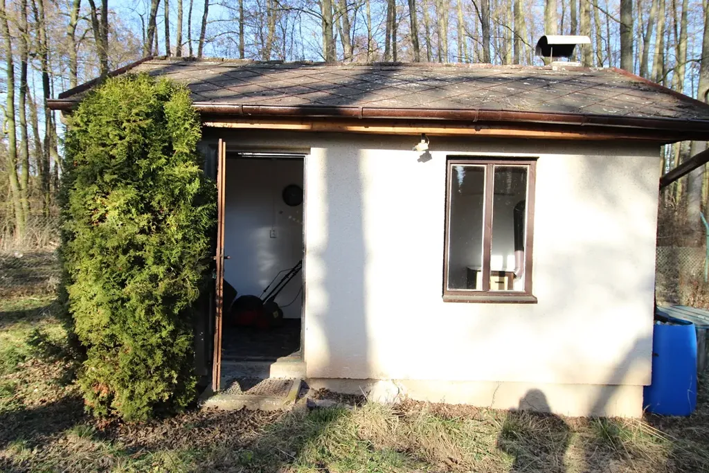 Na oploceném pozemku o rozloze 377 m² (osobní vlastnictví) se nachází samostatně stojící zděná chata. Velkou výhodou je možnost pohodlného příjezdu autem až k pozemku.