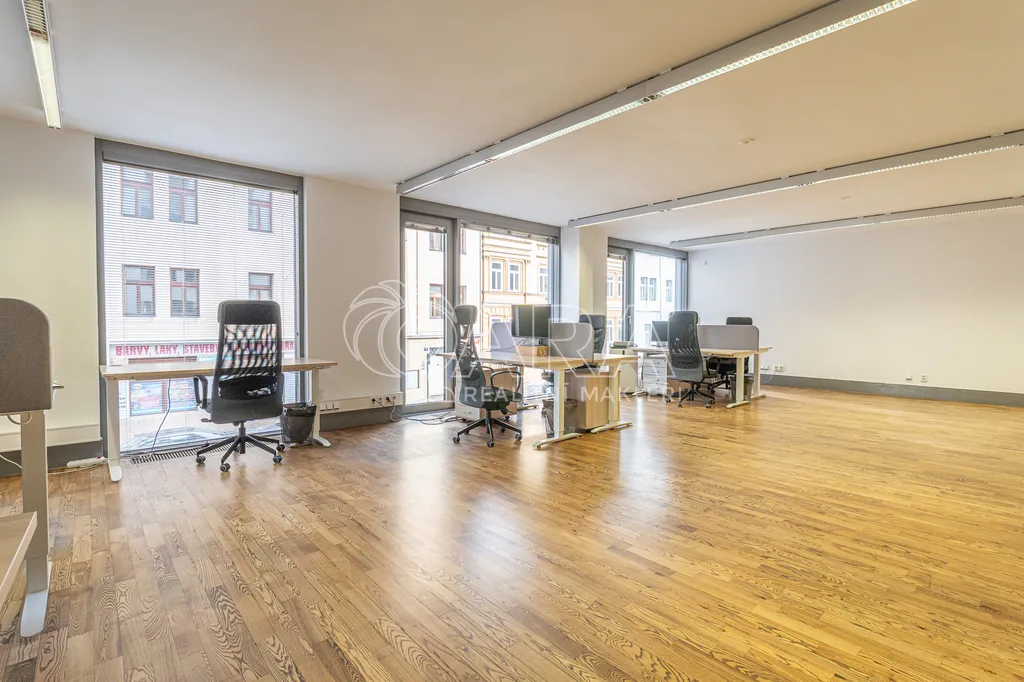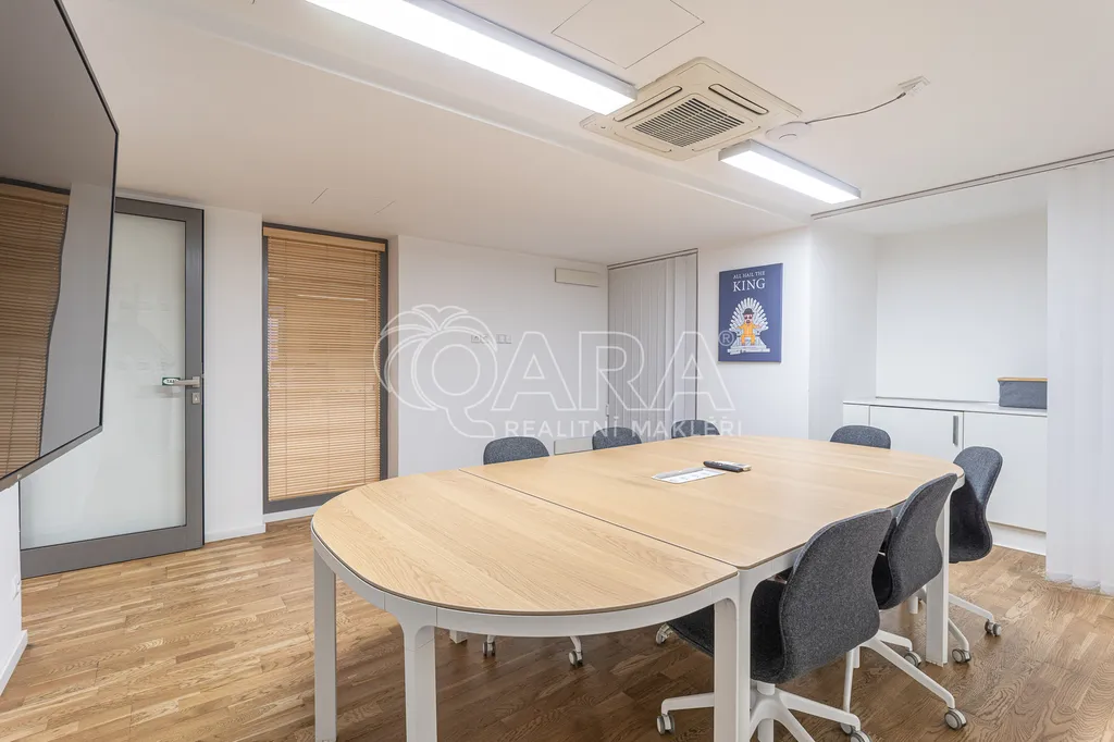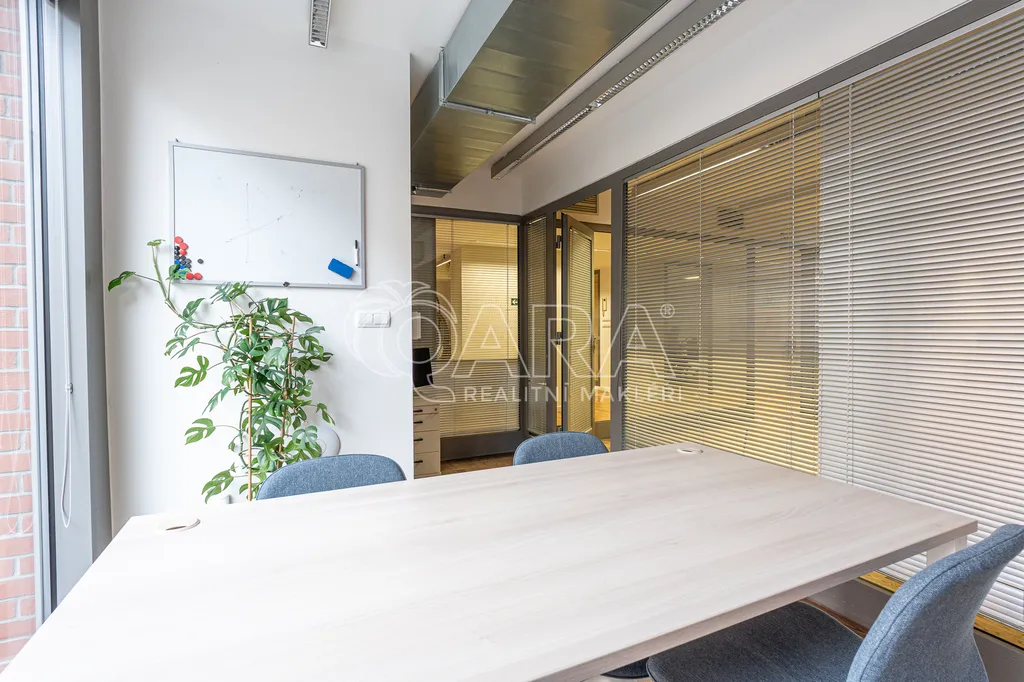 Prostor o celkové rozloze kanceláří 335 m² je klimatizovaný. Dispozice nabízí dvě větší otevřené místnosti, dvě místnosti oddělené skleněnou stěnou, přičemž jedna z nich má vstup na terasu o velikosti 17 m², samostatnou uzavřenou místnost, zasedací místnost a prostor pro recepci či posezení návštěv. Zázemí zahrnuje kuchyňku, jídelní kout, 2x moderní sociální zařízení se sprchou, serverovnu a úklidovou místnost.